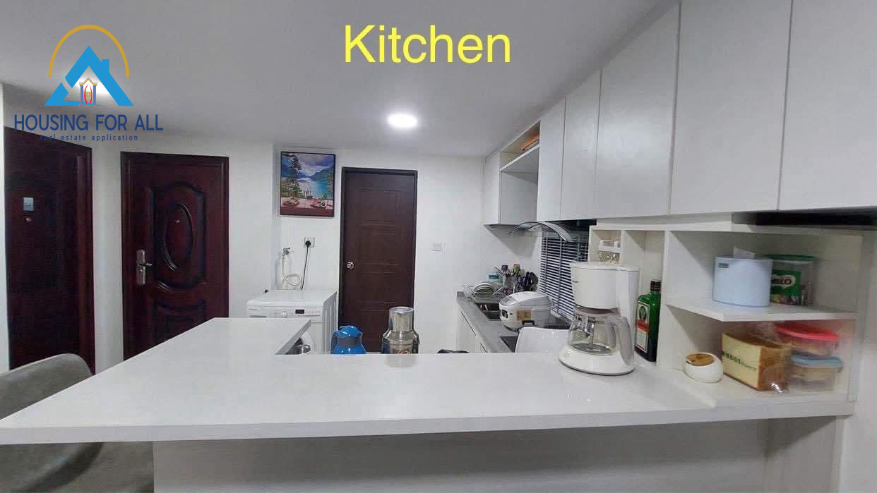 🥰- မီးဖိုခန်းတွင် နံရံကပ်ဘီဒိုများ၊ အညှော်စုပ်စက်၊ kitchen counter များကို ခေတ်မီ စနစ်တကျပြင်ဆင်ထား။